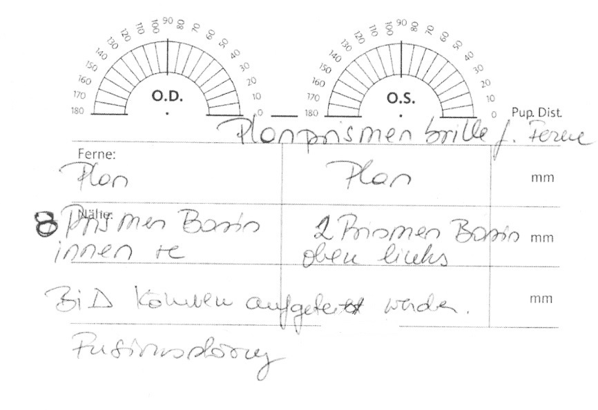 Ok, also: ich dachte, ich kann nur meine Fernbrille (mit 8 Seitenprismen) nehmen, und in Situationen, wo ich schnell von Ferne zu Nähe wechsel (Vorlesungen in der Uni etc), zusätzlich ein Monokel mit 8 Prismen vor einem Auge (hinter dem Brillenglas) halten. Dann wären die Seitenprismen genauso hoch wie bei der Lesebrille: