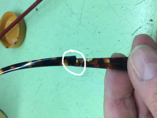 Die Idee der Reparatur war, das Metall des Bügel zu erhalten und den alten porösen Kunststoff weitesgehend auszutauschen. Ursache sind Schweiss, Fette, Haarspray, UV, Wasser, Cremes usw.