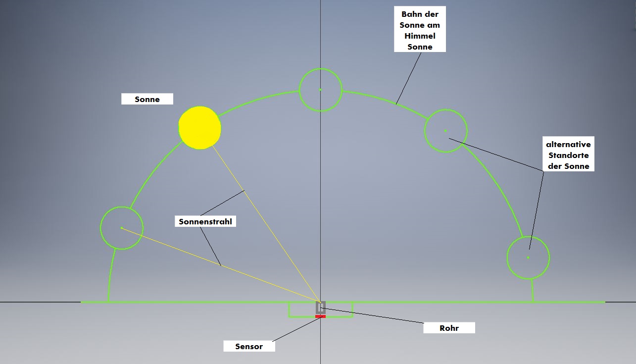 Die Aufgabe wäre, den Sonnenstrahl (gelb) ausgehend vom Sonnenstand (alternative Standorte (grün)) durch das Rohr (grau) ausgerichtet auf den Sensor zu leiten. Das Rohr hat eine Länge X und deswegen, muss das Sonnenlicht so umgelenkt (ich nehme an durch Brechung), dass es durch das Rohr auf den Sensor fällt. Eigentlich hat das Rohr noch eine Neigung von 15° zur vertikalen Achse (schwarze Linie) aber das ist erstmal Nebensache.